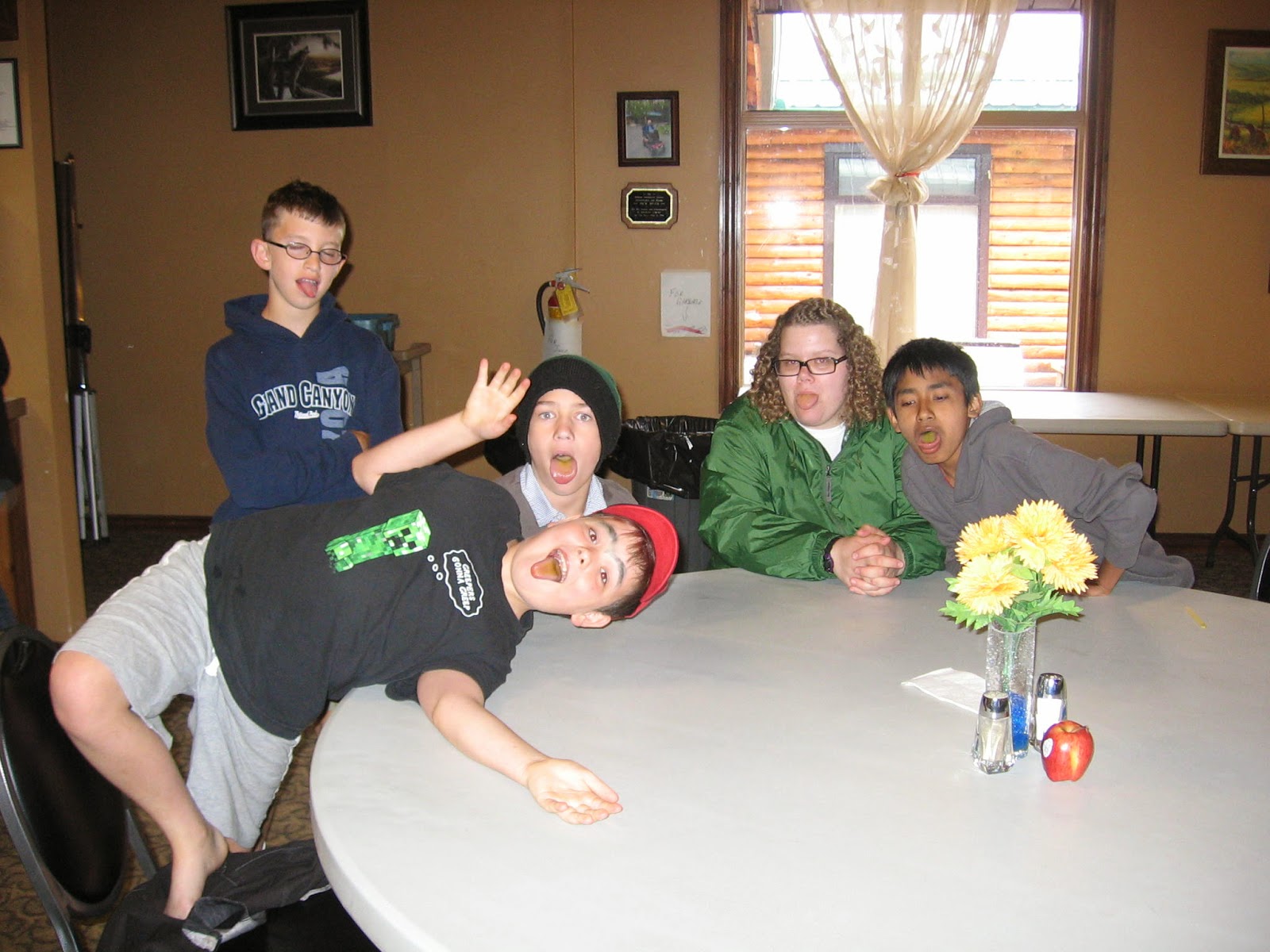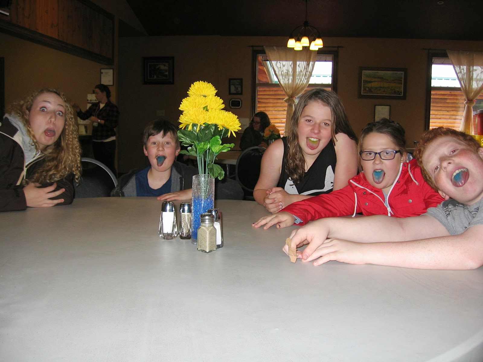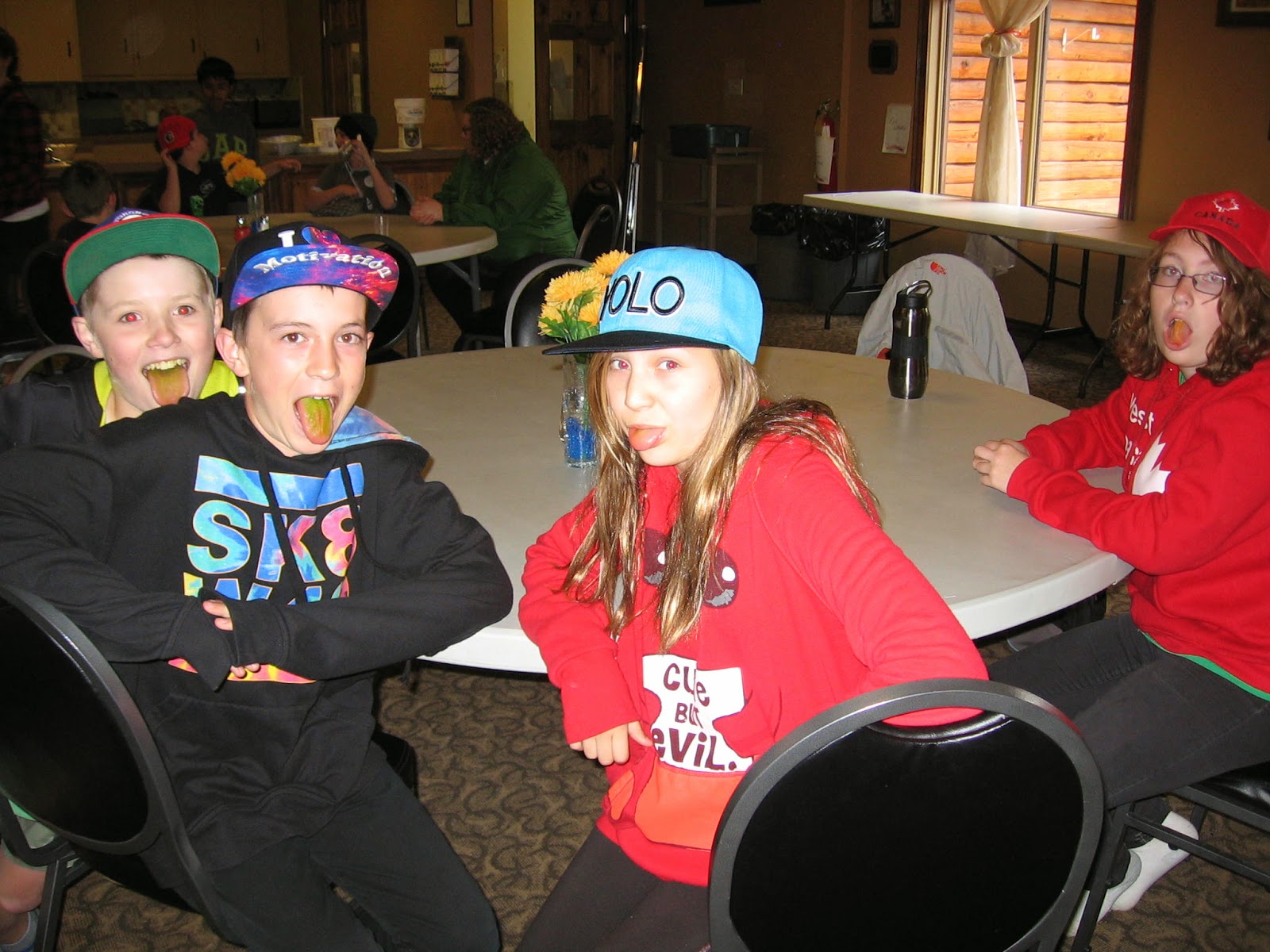 Campers were tired after the long drive and busy afternoon so they had a little down time before a tasty supper of meatloaf, mashed potatoes, gravy, buns, peas, salad and jello for dessert. The rain picked up so we played minute to win it games and jeopardy inside. A snack of popsicles left the kids with colourful tongues that they had fun showing off to everyone.